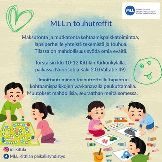 Touhutreffit on kohtaamispaikka Kittilän kirkonkylällä, jonne lasten on kiva tulla vanhempineen. Luvassa on yhteistä tekemistä ja touhuamista. Aika ja paikka: Torstaisin klo 10–12, Nuorisotila Käki 2.0, Valtatie 49, Kittilän Kirkonkylä. Tilaan on esteetön kulku, ja lastenrattailla pääsee sisälle asti. Ilmoittautuminen: Peukuttamalla Kittilän Lapsiperheiden Kohtaamispaikkojen WhatsApp-kanavalla. Ei pakollista, mutta auttaa meitä valmistautumaan. https://www.whatsapp.com/channel/0029VaGnB7yEwEk3tAgxiA1i Eväät: Omat eväät ovat tervetulleita. Tilasta löytyy jääkaappi, vedenkeitin ja mikroaaltouuni sekä ruokailuvälineet – jokainen huolehtii omansa puhtaaksi. Tervetuloa mukaan tutustumaan uusiin Touhutreffitiloihin ja toimintaamme – toivottavasti nähdään Nuorisotilalla! https://kittila.fi/touhutreffit